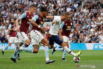 Pesepak bola Tottenham Hotspur Harry Kane (kedua kanan) berhasil membobol gawang lawannya Aston Villa dalam laga minggu pertama Premier League, di Stadion Tottenham Hotspur, London, Inggris, Sabtu (10/8/2019). Hotspur berhasil melibas Villa 3-1 dan Harry Kane menyumbang dua gol untuk timnya. ANTARA FOTO/Reuters-Eddie Keogh/hp.