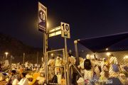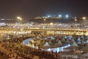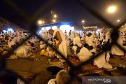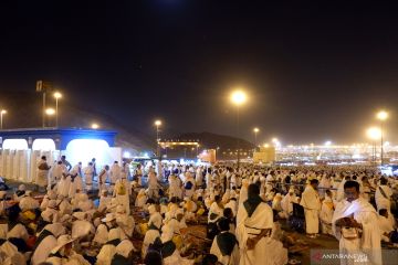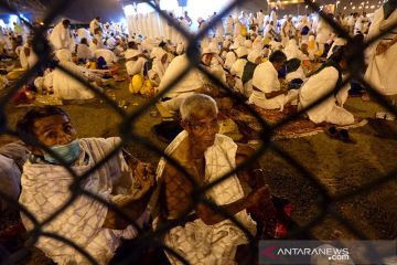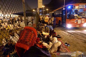 Jamaah haji Indonesia menunggu bus setelah usai mabit di (bermalam) di Muzdalifah, Minggu dini hari (11/8/2019) sebagai salah satu rukun haji, selanjutnya mereka diangkut ke Mina secara bertahap, selanjutnya akan mabit di tenda-tenda di Mina. ANTARA/Hanni Sofia/pri