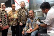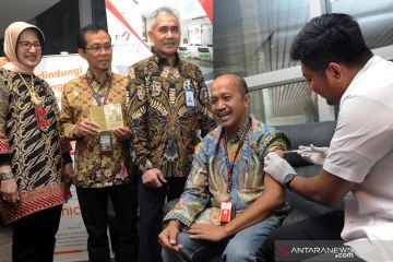 Direktur Utama TelkoMedika Bambang Lusmiadi (kedua kiri) mendampingi Perwakilan Perhimpunan Ahli Penyakit Dalam Indonesia (PAPDI) Iris Rengganis (kiri) dan Direktur SDM Biofarma Disril Revolin Putra (kedua kanan), menyaksikan peragaan penyuntikan vaksinasi kepada Direktur Keuangan TelkoMedika Joko Aswanto (kedua kanan), pada peresmian outlet vaksin TelkoMedia Imunicare, di Jakarta, Senin (12/8/2019). PT Sarana Usaha Sejahtera Insanpalapa (TelkoMedika), anak usaha PT Telkom Indonesia (Persero) Tbk (Telkom), bekerjasama dengan PT Biofarma untuk penyediaan layanan vaksinasi, meliputi vaksinasi Meningitis, vaksinasi Hepatitis B, vaksinasi Influenza, vaksinasi Measles Rubela, vaksinasi CA Cervix, vaksinasi Difteri dan vaksinasi Typhoid, dengan harga yang terjangkau dan bersertifikat internasional ICV (International Certificate of Vaccination) khususnya vaksin meningitis bagi jamaah haji dan umroh. ANTARA FOTO/Audy Alwi/hp.