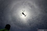 Petugas menyiapkan pendaratan helikopter water bombing milik Badan Nasional Penanggulangan Bencana (BNPB) seusai melakukan pembasahan lahan gambut yang terbakar di Bandar Udara Cut Nyak Dhien, Kabupaten Nagan Raya, Aceh, Senin (12/8/2019). ANTARA FOTO/Tim gabungan pemadam Karhutla/hp.