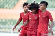 Pesepakbola Indonesia Bagus Kahfi (tengah) mendapat ucapan selamat dari rekannya Sutan Zeco (kanan) dan Salman Arfarid, usai membobol gawang lawan saat bertanding melawan Laos pada penyisihan Grup A Piala AFF U-18 2019 di Stadion Thong Nhat, Ho Chi Minh, Vietnam, Senin (12/8/2019). Indonesia menang atas Laos dengan skor 2-1 (0-0). ANTARA FOTO/Yusran Uccang/hp.