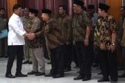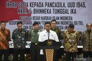 Menko Polhukam Wiranto (kiri) berjabat tangan dengan anak pemimpin Darul Islam/Tentara Islam Indonesia (DI/TII) Sekarmaji Marijan Kartosuwiryo, Sarjono Kartosuwiryo (tengah) dalam acara pengucapan ikrar setia kepada Pancasila, UUD 45, NKRI dan Bhineka Tunggal Ika di Jakarta, Selasa (13/08/2019). Sebanyak 14 orang Keluarga Besar Harokah Islam Indonesia, mantan anggota Darul Islam/Tentara Islam Indonesia (DI/TII) dan mantan anggota Negara Islam Indonesia (NII) mengikuti pembacaan ikrar setia tersebut. ANTARA FOTO/Akbar Nugroho Gumay/pras.