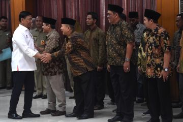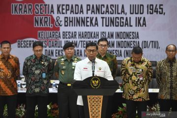 Menko Polhukam Wiranto memberikan arahan dalam acara pengucapan ikrar setia kepada Pancasila, UUD 45, NKRI dan Bhineka Tunggal Ika di Jakarta, Selasa (13/08/2019). Sebanyak 14 orang Keluarga Besar Harokah Islam Indonesia, mantan anggota Darul Islam/Tentara Islam Indonesia (DI/TII) dan mantan anggota Negara Islam Indonesia (NII) mengikuti pembacaan ikrar setia tersebut. ANTARA FOTO/Akbar Nugroho Gumay/pras.