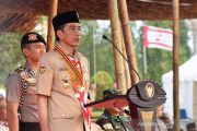 Presiden Joko Widodo menjadi pembina upacara di Apel Besar Peringatan Hari Pramuka ke-58 tingkat nasional di Bumi Perkemahan Pramuka Cibubur, Jakarta Timur, Rabu (14/8/2019). Kegiatan perayaan ulang tahun kali ini diisi dengan berbagai kegiatan seperti gerakan menolak plastik sekali pakai, pementasan seni dan lain-lain. ANTARA/Anom Prihantoro/aa.