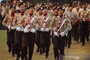Sejumlah anggota Pramuka saka Bhayangkara melakukan atraksi saat Apel Besar Peringatan Hari Pramuka ke-58 tingkat nasional di Bumi Perkemahan Pramuka Cibubur, Jakarta Timur, Rabu (14/8/2019). Kegiatan dihadiri Presiden Joko Widodo dan diisi dengan berbagai kegiatan seperti gerakan menolak plastik sekali pakai, pementasan seni dan lain-lain. ANTARA/Anom Prihantoro/aa.