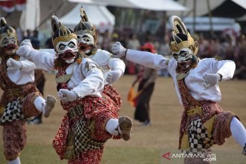 Sejumlah anggota Pramuka mengenakan kostum Hanoman saat menari di Apel Besar Peringatan Hari Pramuka ke-58 tingkat nasional di Bumi Perkemahan Pramuka Cibubur, Jakarta Timur, Rabu (14/8/2019). Kegiatan dihadiri Presiden Joko Widodo dan diisi dengan berbagai kegiatan seperti gerakan menolak plastik sekali pakai, pementasan seni dan lain-lain. ANTARA/Anom Prihantoro/aa.