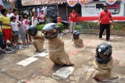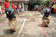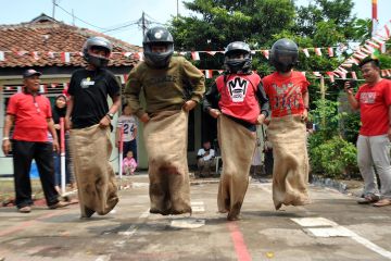 Sejumlah peserta beradu cepat dalam lomba balap karung helm di lapangan RT 02 dan 03/04, Desa Laladon, Ciomas, Kabupaten Bogor, Jawa Barat, Sabtu (17/8/2019). Lomba balap karung helm tersebut diselenggarakan untuk memeriahkan peringatan HUT ke-74 Kemerdekaan RI. ANTARA FOTO/Arif Firmansyah/wsj.