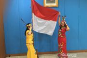 Peneliti obat kanker dari tanaman Bajakah, Aysa Aurelia Maharani (kiri), dan Anggina Rafitri (kanan) menghormat bendera Merah Putih disela-sela menghadiri upacara Hari Kemerdekaan RI di kantor Kementerian Pendidikan dan Kebudayaan di Jakarta, Sabtu (17/8/2019). ANTARA/Abdu Faisal/aa.