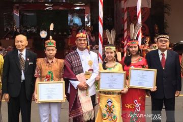 Peneliti obat kanker dari tanaman Bajakah, Yazid Rafli Akbar (pertama kiri), Aysa Aurelia Maharani (kedua kanan), dan Anggina Rafitri (pertama kanan) berfoto bersama usai diberi piagam penghargaan oleh Menteri Pendidikan dan Kebudayaan, Muhadjir Effendy di Jakarta, Sabtu (17/8/2019). Mereka diberi penghargaan atas prestasi memenangkan medali emas bidang Life Sciences pada ajang World Invention Creativity Olympic (WICO) di Seoul, Korea Selatan. ANTARA/Abdu Faisal/aa.