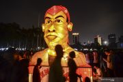 Sejumlah pengunjung melintas di dekat lampion karakter pahlawan nasional Jenderal Besar Sudirman pada acara Festival of Light di Monas, Jakarta Pusat, Sabtu (17/8/2019). Festival lampion dan laser bertemakan HUT ke-74 Kemerdekaan RI itu berlangsung dari 14-25 Agustus 2019. ANTARA FOTO/Fakhri Hermansyah/wsj.