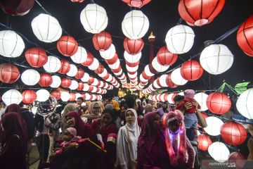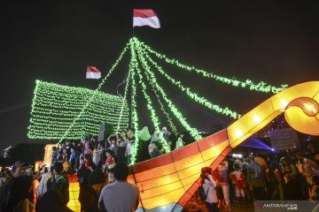 Warga mengunjungi Festival of Light di Monas, Jakarta Pusat, Sabtu (17/8/2019). Festival lampion dan laser bertemakan HUT ke-74 Kemerdekaan RI itu berlangsung dari 14-25 Agustus 2019. ANTARA FOTO/Fakhri Hermansyah/wsj.