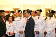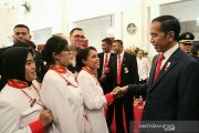 Presiden Joko Widodo berbincang kepada sejumlah anggota Paskibraka saat acara ramah tamah dalam rangkaian perayaan HUT ke 74 RI di Istana Negara, Jakarta pada Sabtu malam (17/8/2019). Dalam acara silaturahmi tersebut presiden memberikan pesan menjaga persatuan kepada para generasi muda. ANTARA/Bayu Prasetyo/aa.