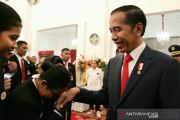 Presiden Joko Widodo berbincang kepada salah seorang anggota Paskibraka saat acara ramah tamah dalam rangkaian perayaan HUT ke 74 RI di Istana Negara, Jakarta pada Sabtu malam (17/8/2019). Dalam acara silaturahmi tersebut presiden memberikan pesan menjaga persatuan kepada para generasi muda. ANTARA/Bayu Prasetyo/aa.