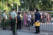 Personel kepolisian China turut membantu mengatur antrean para peserta upacara HUT ke-74 RI di depan pintu gerbang KBRI Beijing, Sabtu (17/8/2019). Selain upacara peringatan Hari Kemerdekaan RI di KBRI Beijing juga dimeriahkan dengan pertunjukan seni dan budaya Nusantara oleh para WNI dan warga China yang memiliki perikatan dengan Indonesia atau Huaqiao Indonesia. ANTARA FOTO/M. Irfan Ilmie/ama.
