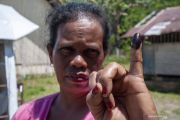 Seorang warga menunjukkan jarinya yang telah dilumuri tinta usai mencoblos pada Pemungutan Suara Ulang (PSU) di TPS 1, Dusun I, Desa Bolobia, Kecamatan Kinovaro, Sigi, Sulawesi Tengah, Minggu (18/8/2019). PSU yang dipantau langsung KPU RI dan Bawaslu RI itu adalah satu-satunya PSU yang ditetapkan oleh Mahkamah Konstitusi (MK) dari sekitar 340 kasus sengketa hasil Pemilu yang digelar serentak pada 17 April 2019 lalu. ANTARA FOTO/Basri Marzuki/hp.