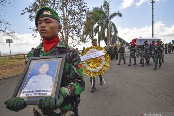 Anggota TNI mengusung peti jenazah Praka Anumerta Sirwandi M. Sahidillah yang tiba di Lombok International Airport di Praya, Lombok Tengah, NTB, Senin (19/8/2019). Praka Anumerta Sirwandi M. Sahidillah asal Sakra Lombok Timur adalah prajurit TNI dari Batalyon Infanteri (Yonif) RK 751/VJS yang meninggal karena terkena peluru kelompok kriminal separatis bersenjata (KKSB) di Papua. ANTARA FOTO/Ahmad Subaidi/hp.