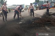 Sejumlah polisi membersihkan sisa kerusuhan di salah satu ruas jalan di Manokwari, Papua Barat, Selasa (20/8/2019). Kondisi Manokwari sudah kondusif dan warga mulai melakukan aktivitas di ruang publik meskipun dalam skala terbatas. ANTARA FOTO/Toyiban/pras.