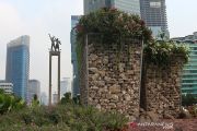 Petugas Dinas Kehutanan DKI Jakarta melakukan penataan taman di sekitar instalasi batu beronjong (gabion) di bilangan Jalan MH Thamrin (Bundaran HI), Jakarta, Kamis (22/8/2019). Instalasi Gabion ini memiliki anggaran Rp150 juta ini dimaksudkan sebagai pengurang polusi dan pengganti instalasi Getah Getih yang sebelumnya berdiri di tempat yang sama sebagai hiasan kota. ANTARA/Ricky Prayoga/pri