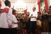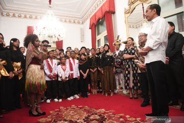 Presiden Joko Widodo menyapa musisi-musisi muda indonesia yang akan tampil dalam konser Talenta Muda Bhinneka Tunggal Ika di Istana Negara, Jakarta, Jumat (23/8/2019). Konser itu menampilkan musisi-musisi muda indonesia yang telah berprestasi di tingkat internasional dan diharapkan dapat memacu generasi muda Indonesia untuk dapat terus mengembangkan potensi dan kreativitas. ANTARA FOTO/Akbar Nugroho Gumay/pras.