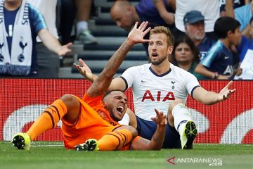 Pemain Newcastle United Jamaal Lascelles terjatuh bersama pemain Tottenham Hotspur Harry Kane Sanchez pada pertandingan Liga Inggris di stadion Tottenham Hotspur, London, Minggu (25/8/2019). Newcastle berhasil mengalahkan tuan rumah Tottenham Hotspur dengan skor 1-0. ANTARA FOTO/REUTERS/PETER NICHOLLS/pras.