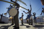 Genderang Suling Gita Jala Taruna beraksi saat prosesi "parade roll" di Pelabuhan Japan Maritime Self-Defense Force Hansin Base, Kota Kobe, Jepang, Senin (26/8/2019). KRI Bima Suci akan menempuh perjalanan dari Osaka, Jepang menuju Busan, Korea Selatan selama lima hari. ANTARA FOTO/M Agung Rajasa/pras.