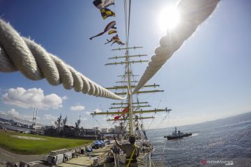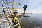 Taruna AAL tingkat III angkatan ke-66 mengikuti prosesi "parade roll" di Pelabuhan Japan Maritime Self Defense Force Hansin Base, Kota Kobe, Jepang, Senin (26/8/2019). KRI Bima Suci akan menempuh perjalanan dari Osaka, Jepang menuju Busan, Korea Selatan selama lima hari. ANTARA FOTO/M Agung Rajasa/pras.