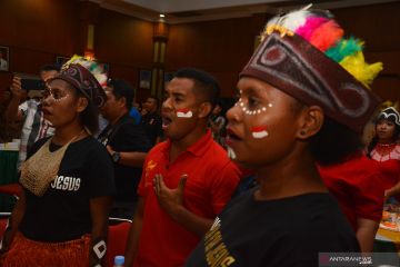 Mahasiswa dari Papua, Ambon dan Nusa Tenggara (Pamanusa) menyanyikan lagu kebangsaan Indonesia Raya sebelum pentas seni budaya Papua dan doa bersama lintas agama untuk NKRI di Pemkab Jombang, Jawa Timur, Senin (26/8/2019) malam. Doa bersama lintas agama bersama Forkopimda serta perkumpulan orang Papua, Ambon dan Nusa Tenggara (Pamanusa) tersebut untuk memupuk rasa persatuan dan kesatuan sesama anak bangsa suku di Indonesia serta menjaga kedamaian mapun keutuhan NKRI. ANTARA FOTO/Syaiful Arif/hp.