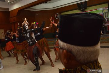 Mahasiswa dari Papua menampilkan tarian persahabatan dalam pentas seni budaya Papua dan doa bersama lintas agama untuk NKRI di Pemkab Jombang, Jawa Timur, Senin (26/8/2019) malam. Doa bersama lintas agama bersama Forkopimda serta perkumpulan orang Papua, Ambon dan Nusa Tenggara (Pamanusa) tersebut untuk memupuk rasa persatuan dan kesatuan sesama anak bangsa suku di Indonesia serta menjaga kedamaian mapun keutuhan NKRI. ANTARA FOTO/Syaiful Arif/hp.