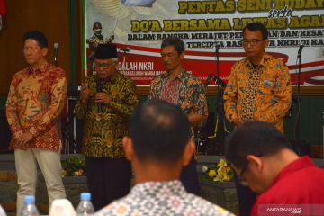 Tokoh lintas agama memanjatkan doa untuk kedamaian NKRI di Pemkab Jombang, Jawa Timur, Senin (26/8/2019) malam. Doa bersama lintas agama bersama Forkopimda serta perkumpulan orang Papua, Ambon dan Nusa Tenggara (Pamanusa) tersebut untuk memupuk rasa persatuan dan kesatuan sesama anak bangsa suku di Indonesia serta menjaga kedamaian mapun keutuhan NKRI. ANTARA FOTO/Syaiful Arif/hp.