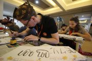 Sejumlah mahasiswa asing membuat tulisan aksara Jawa saat mengikuti "Ubaya Summer Program 2019" di Universitas Surabaya (Ubaya), Jawa Timur, Kamis (29/8/2019). Kegiatan yang diikuti 26 mahasiswa asing dari 10 negara tersebut untuk mengenalkan kebudayaan yang ada di Indonesia salah satunya tulisan aksara Jawa. ANTARA FOTO/Moch Asim/hp.