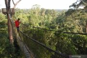 Wisatawan menikmati pemandangan dari atas Canopy Bridge Bukit Bangkirai, Kecamatan Samboja, Kutai Kartanegara, Kalimantan Timur, Kamis (29/8/2019). Lokasi wisata yang memiliki luas sekitar 1.500 hektar itu menawarkan pemandangan alam hutan hujan tropis di kawasan yang akan menjadi ibu kota negara baru. ANTARA FOTO/Akbar Nugroho Gumay/wsj.