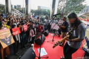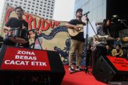 Grup Musik Efek Rumah Kaca menghibur penonton saat aksi solidaritas Selamatkan KPK di Gedung KPK, Jakarta, Jumat (30/8/2019). Aksi tersebut merupakan bentuk protes pada keputusan Panitia Seleksi Calon Pimpinan KPK yang tetap meloloskan sejumlah nama bermasalah hingga tahap wawancara dan uji publik atau seleksi tahap akhir. ANTARA FOTO/Rivan Awal Lingga/hp.
