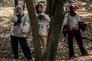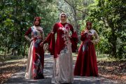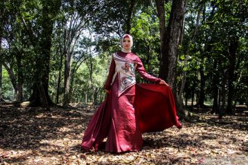 Model mengenakan busana rancangan desainer Lia Afif saat sesi foto di kawasan kebun raya Purwodadi, Pasuruan, Jawa Timur, Sabtu (31/8/2019). Lia Afif fashion designer menghadirkan 12 desain busana muslim dengan rangkaian busana Batik Tulis Kutai Timur nan Eksotik yang bertema "Etuda Enggana" yang terinspirasi harmoni nada dan burung Enggang untuk mengikuti peragaan busana ASC Fashion Week- New York Fashion Week yang akan didakan pada tanggal 8 September 2019 di Matropolitan Paviliun, New York. ANTARA FOTO/Umarul Faruq/hp.