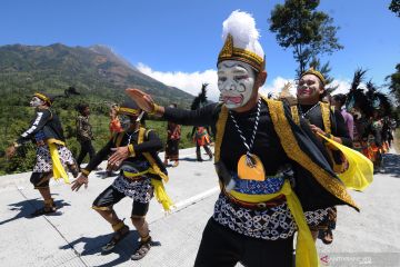 Sejumlah peserta mengenakan kostum tokoh wayang punokawan saat mengikuti Kirab Kerbau Merbabu-Merapi di Selo, Boyolali, Jawa Tengah, Sabtu (31/8/2019). Kirab tersebut merupakan rangkaian tradisi 1 Suro dalam penanggalan Jawa atau 1 Muharram 1441 H dalam penanggalan Islam sebagai bentuk wujud syukur warga lereng Gunung Merbabu dan Gunung Merapi kepada Tuhan Yang Maha Esa atas perlindungan dan hasil pertanian. ANTARA FOTO/Aloysius Jarot Nugroho./hp.