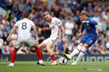 Pesepak bola Chelsea Ross Barkley (kanan) berupaya mengecoh pesepak bola Sheffield United Luke Freeman dan Oliver McBurnie dalam laga pekan keempat Liga Inggris, di Stadion Stamford Bridge, London, Inggris, Sabtu (31/8/2019). ANTARA FOTO/Reuters-Paul Childs/hp.