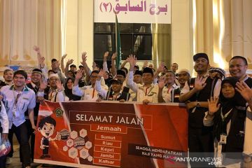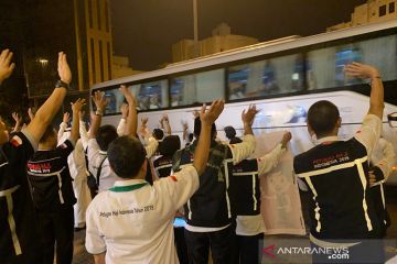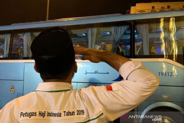 Petugas haji daerah kerja Mekkah melepas kepulangan jamaah haji Kloter 15 embarkasi Batam (BTH 15), Sabtu (31/8/2019) malam menjelang dinihari dari Mekkah. Mereka menjadi kelompok terakhir yang meninggalkan Kota Mekkah serta menandai berakhirnya pemulangan jamaah haji gelombang I dari kota kelahiran nabi ini. ANTARA/Hanni Sofia/am.