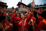 Umat Hindu merayakan festival Teej di kuil Pashupatinath, Kathmandu, Nepal, Senin (2/9/2019). Festival tiga hari tersebut memperingati menyatunya Dewi Parwati dan Dewa Siwa dan bertujuan merayakan cinta dan pengabdian istri. ANTARA FOTO/REUTERS/Navesh Chitrakar/foc.