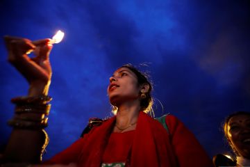 Umat Hindu memanjatkan doa saat festival Teej di kuil Pashupatinath, Kathmandu, Nepal, Senin (2/9/2019). Festival tiga hari tersebut memperingati menyatunya Dewi Parwati dan Dewa Siwa dan bertujuan merayakan cinta dan pengabdian istri. ANTARA FOTO/REUTERS/Navesh Chitrakar/foc.