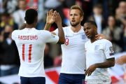 Pesepak bola Inggris Raheem Sterling (kanan) melakukan selebrasi dengan rekannya Harry Kane dan Marcus Rashford (kiri) setelah berhasil membobol gawang lawannya Bulgaria dalam laga kualifikasi Piala Eropa 2020, di Stadion Wembley, London, Inggris, Sabtu (7/9/2019). Inggris membungkam Bulgaria 4-0 dan Kapten timnas Inggris Harry Kane berhasil membuat hat-trick dalam pertandingan ini, ANTARA FOTO/Reuters-Tony O'Brien/hp.