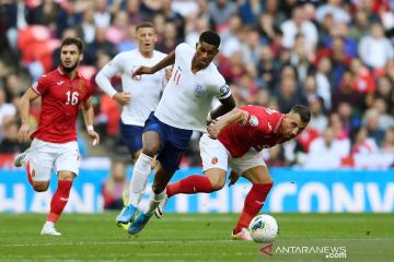 Pesepak bola Inggris Marcus Rashford (kedua kanan) berebut bola dengan pesepak bola Bulgaria Nikolay Bodurov (kanan) dalam laga kualifikasi Piala Eropa 2020, di Stadion Wembley, London, Inggris, Sabtu (7/9/2019). Inggris membungkam Bulgaria 4-0 dan Kapten timnas Inggris Harry Kane berhasil membuat hat-trick dalam pertandingan ini, ANTARA FOTO/Reuters-Tony O'Brien/hp.