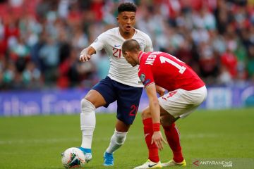 Peserpak bola Inggris Jadon Sancho (kiri) berupaya melewati penjagaan lawannya pesepak bola Bulgaria Anton Nedyalkov dalam laga kualifikasi Piala Eropa 2020, di Stadion Wembley, London, Inggris, Sabtu (7/9/2019). Inggris membungkam Bulgaria 4-0 dan Harry Kane berhasil membuat hat-trick dalam pertandingan ini, ANTARA FOTO/Reuters-Andrew Boyers/hp.