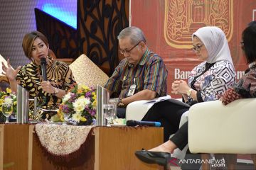 Moderator talkshow Setyoko Agustina (kiri) di Semarang, Selasa (10/9/2019) memandu bincang-bincang Badan Pengawas Obat dan Makanan dalam Forum Koordinasi Teknis Pengembangan UMKM untuk menyatukan pola pikir, menciptakan kesamaan pandangan dan sinergisme antara para pemangku kepentingan. ANTARA/Anom Prihantoro/am.