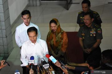Presiden Joko Widodo (kiri) didampingi Ibu Negara Iriana Joko Widodo (ketiga kiri) dan putra Gibran Rakabuming (kiri) memberi keterangan pers di Rumah Sakit Pusat Angkatan Darat (RSPAD) Gatot Soebroto, Jakarta, Rabu (11/09/2019). Presiden Joko Widodo menyatakan belasungkawa atas wafatnya Presiden ketiga Republik Indonesia BJ Habibie pada hari Rabu (11/9/2019) pukul 18.05 WIB di RSPAD Gatot Soebroto, Jakarta. ANTARA FOTO/M Risyal Hidayat/wsj.