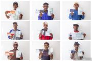 Kolase foto portrait sejumlah warga terdampak tumpahan minyak mentah memegang tabungan Bank BNI, BRI dan Bank Mandiri yang berisi dana kompensasi dari Pertamina di Kantor Desa Sedari, Cibuaya, Karawang, Jawa Barat, Rabu (11/9/2019). Pertamina Hulu Energi Offshore North West Java melakukan pencairan dana kompensasi tahap awal sebesar Rp900 ribu per warga setiap bulan selama dua bulan dengan total dana Rp18,54 miliar kepada 10.271 warga terdampak tumpahan minyak mentah sumur YYA-1 yang telah terverifikasi. Kompensasi tersebut dicairkan melalui tabungan Bank BNI, BRI dan Mandiri. ANTARA FOTO/M Ibnu Chazar/wsj.