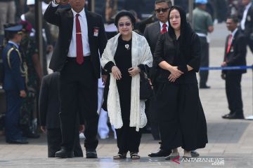 Presiden ke-5 Republik Indonesia Megawati Soekarnoputri (tengah) bersama Menko PMK Puan Maharani (kanan) menghadiri pemakaman almarhum Presiden ke-3 Republik Indonesia BJ Habibie di Taman Makam Pahlawan Nasional Utama (TMP) Kalibata, Jakarta, Kamis (12/9/2019). ANTARA FOTO/Wahyu Putro A/foc.