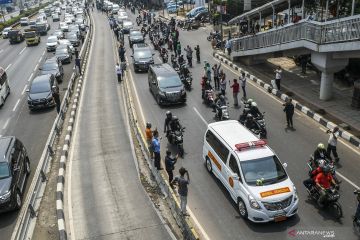 Iring-iringan mobil jenazah yang membawa almarhum Presiden ke-3 Republik Indonesia BJ Habibie berjalan menuju Taman Makam Pahlawan Nasional Utama Kalibata di Jalan Gatot Subroto, Jakarta, Kamis (12/9/2019). BJ Habibie meninggal dunia pada hari Rabu (11/9/2019) pukul 18.05 WIB setelah menjalani perawatan di RSPAD dan akan dimakamkan di Taman Makam Pahlawan Nasional Utama Kalibata, Jakarta. ANTARA FOTO/Galih Pradipta/foc.