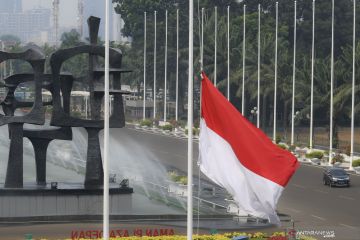 Bendera Merah Putih berkibar setengah tiang di halaman kompleks parlemen, Senayan, Jakarta, Kamis (12/9/2019). Pengibaran bendera setengah tiang tersebut dilakukan sebagai Hari Berkabung Nasional selama tiga hari ke depan untuk menghormati almarhum Presiden ke-3 Republik Indonesia BJ Habibie yang meninggal dunia pada hari Rabu (11/9/2019). ANTARA FOTO/Nova Wahyudi/aww.
