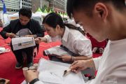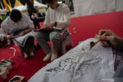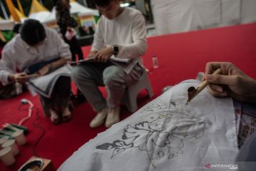Sejumlah peserta mengikuti lokakarya membatik dalam Festival Indonesia 2019, di Cheonggye Plaza, Seoul, Korea Selatan, Jumat (20/9/2019). Festival yang diselenggarakan oleh Kedutaan Besar Republik Indonesia (KBRI) untuk Korea Selatan itu menampilkan pertunjukan tarian, musik, lokakarya serta pameran produk hasil kerajinan tangan dan berlangsung hingga 22 September 2019. ANTARA FOTO/Aprillio Akbar/foc.