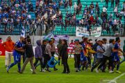 Petugas berupaya menghalau suporter yang memasuki lapangan dalam pertandingan lanjutan Liga 1 2019 antara PSIS Semarang melawan Persebaya yang seharusnya digelar tanpa penonton di Stadion Moch Soebroto, Magelang, Jawa Tengah, Jumat (20/9/2019). Dalam pertandingan yang sempat dihentikan wasit karena insiden kericuhan suporter itu PSIS Semarang dikalahkan Persebaya dengan skor 0-4. ANTARA FOTO/Aji Styawan/foc.