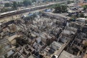 Foto udara rumah-rumah yang terbakar di kawasan Balimester, Jatinegara, Jakarta, Sabtu (21/9/2019). Kebakaran yang terjadi pada Sabtu (21/9/2019) dini hari tersebut menghanguskan 129 rumah, diduga terjadi akibat hubungan pendek (korsleting) arus listrik. ANTARA FOTO/Galih Pradipta/wsj